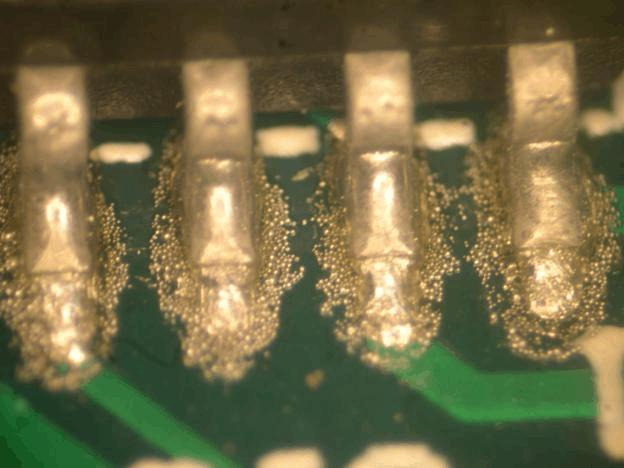 錫球大多數(shù)發(fā)生在PCB零件面,由于PCB過錫時(shí)未干的助焊劑揮發(fā),或者空氣中水汽太多,當(dāng)這些水分接觸到高溫的熔錫時(shí),氣體大量膨脹,造成錫的爆發(fā),錫就被噴涌而出形成錫球。